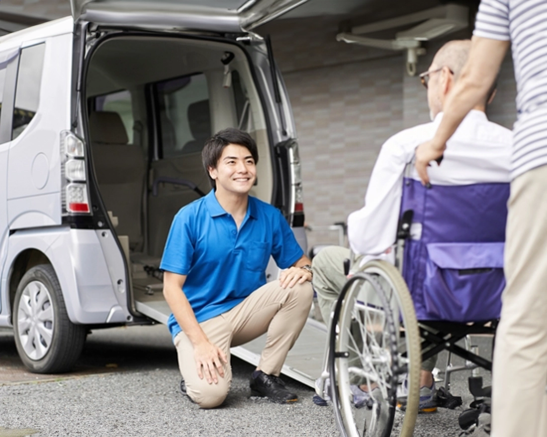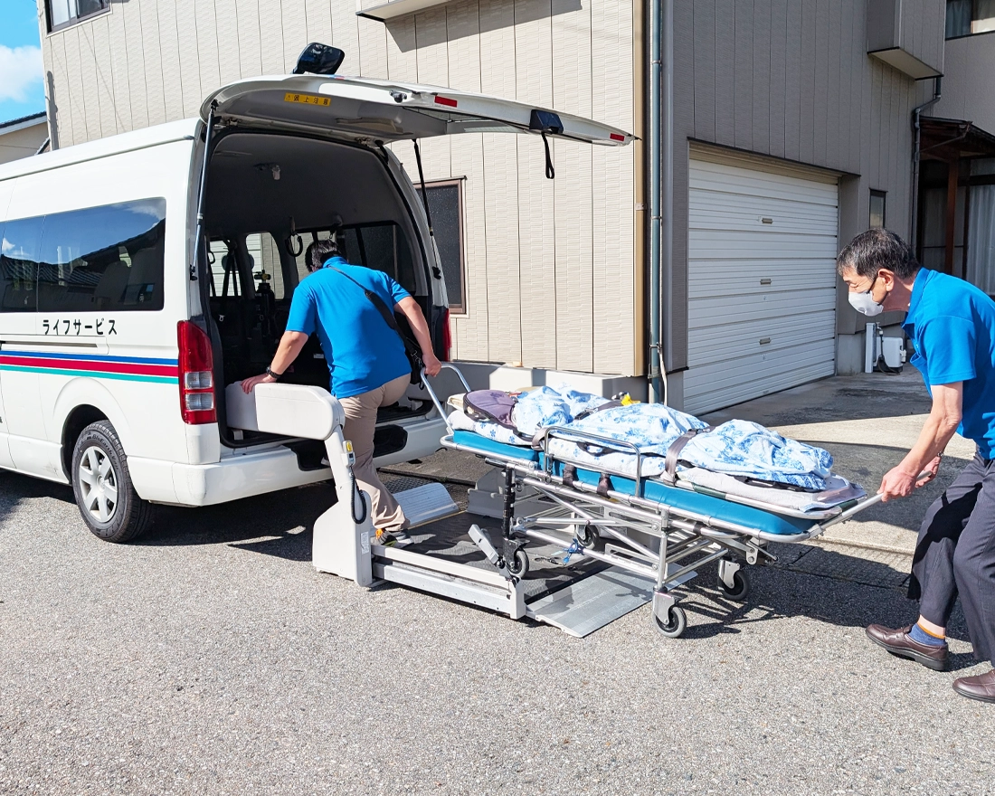ライフ福祉送迎サービスでは、介護と福祉の地域社会に貢献し安心安全のサービスを提供しています。寝たきりや車いす生活の方は寝台や車いすに乗ったまま移動できる、介護送迎事業を行っています。経験抱負なスタッフがベットからベットへ玄関から玄関へ、丁寧な車の乗降と安全運転で移動のサポートをいたします。介護施設や病院への転院、病院への受診、近くのお出かけから県外まで、ご相談に応じて対応いたします。